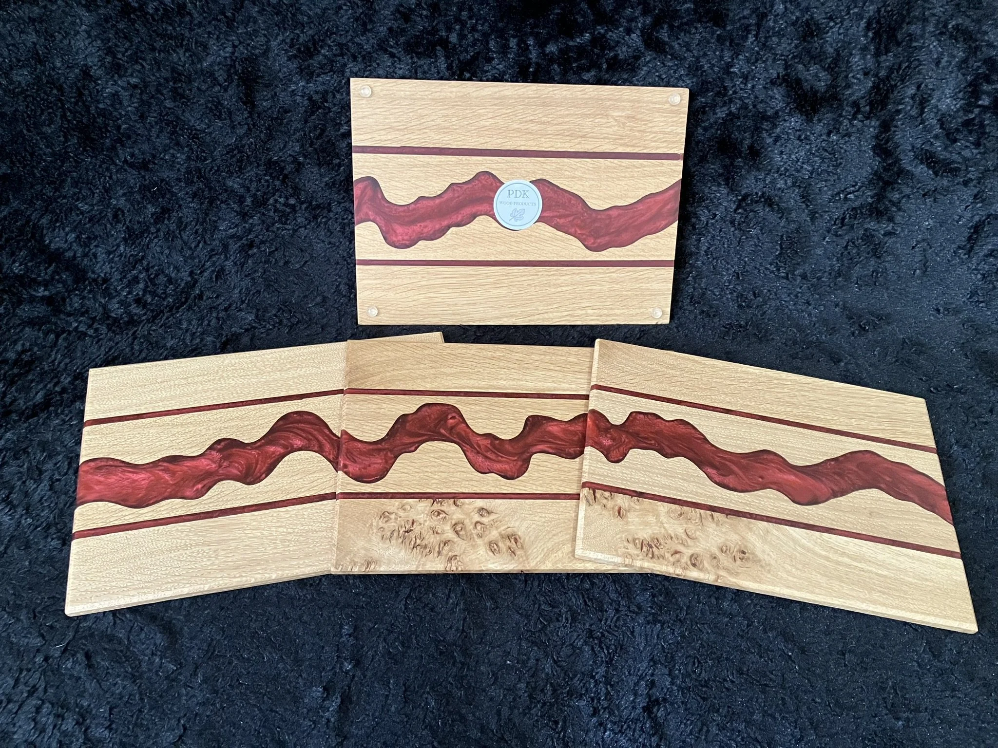 We currently make and stock 3 styles of Oak/resin place mat sets: The Resin River and The Resin Strip. We source most of our wood locally and occasionally from small wood mills we find here in the UK. We also like to use upcycled/repurposed wood whenever possible from other items that would have been thrown away.
