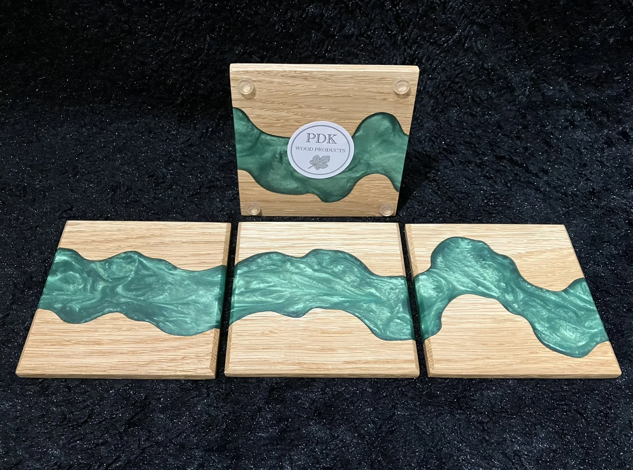 Hand-crafted solid Oak and resin place mats to match our range of coasters. Each set of 4 is individually cut to approximately 24.5cm x 18cm x 1cm with bevelled edges, sanded, treated with wood oil, and fitted with non-slip pads.